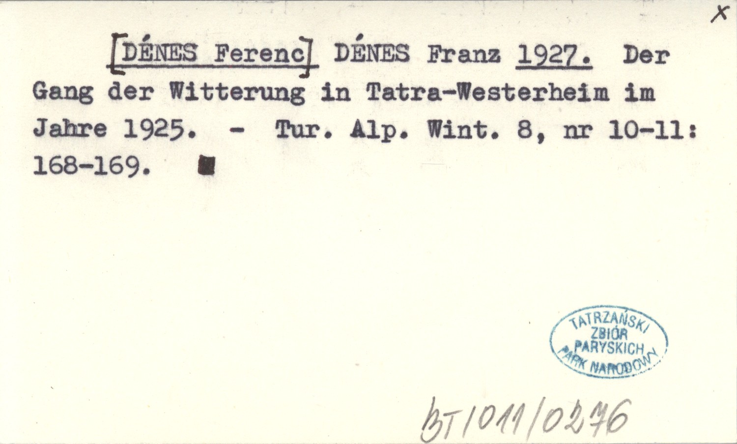 DÉNES Franz [DÉNES Ferenc] 1927 Der Gang der Witterung in Tatra-Westerheim im Jahre 1925.