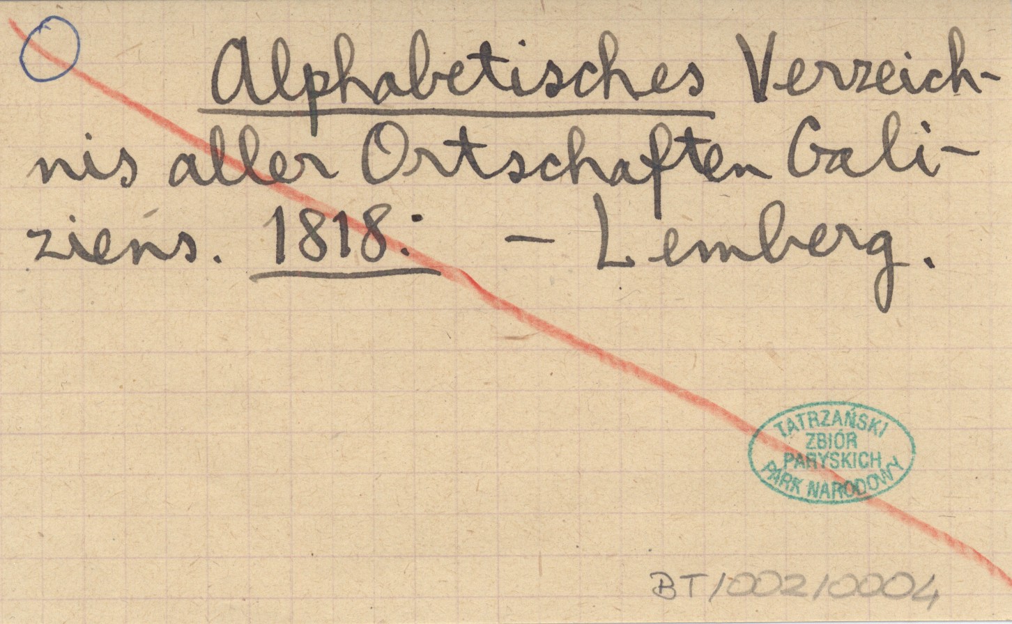 Alphabetisches Verzeichnis aller Ostschaften Galiziens. 1818