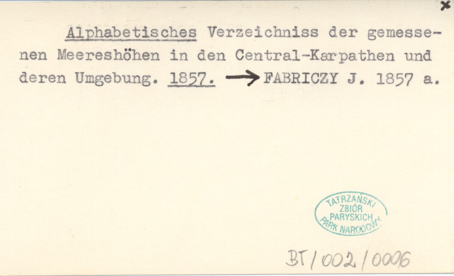 Alphabetisches Verzeichniss der gemessenen Meereshöhen in den Central-Karpathen und deren Umgebung. 1857