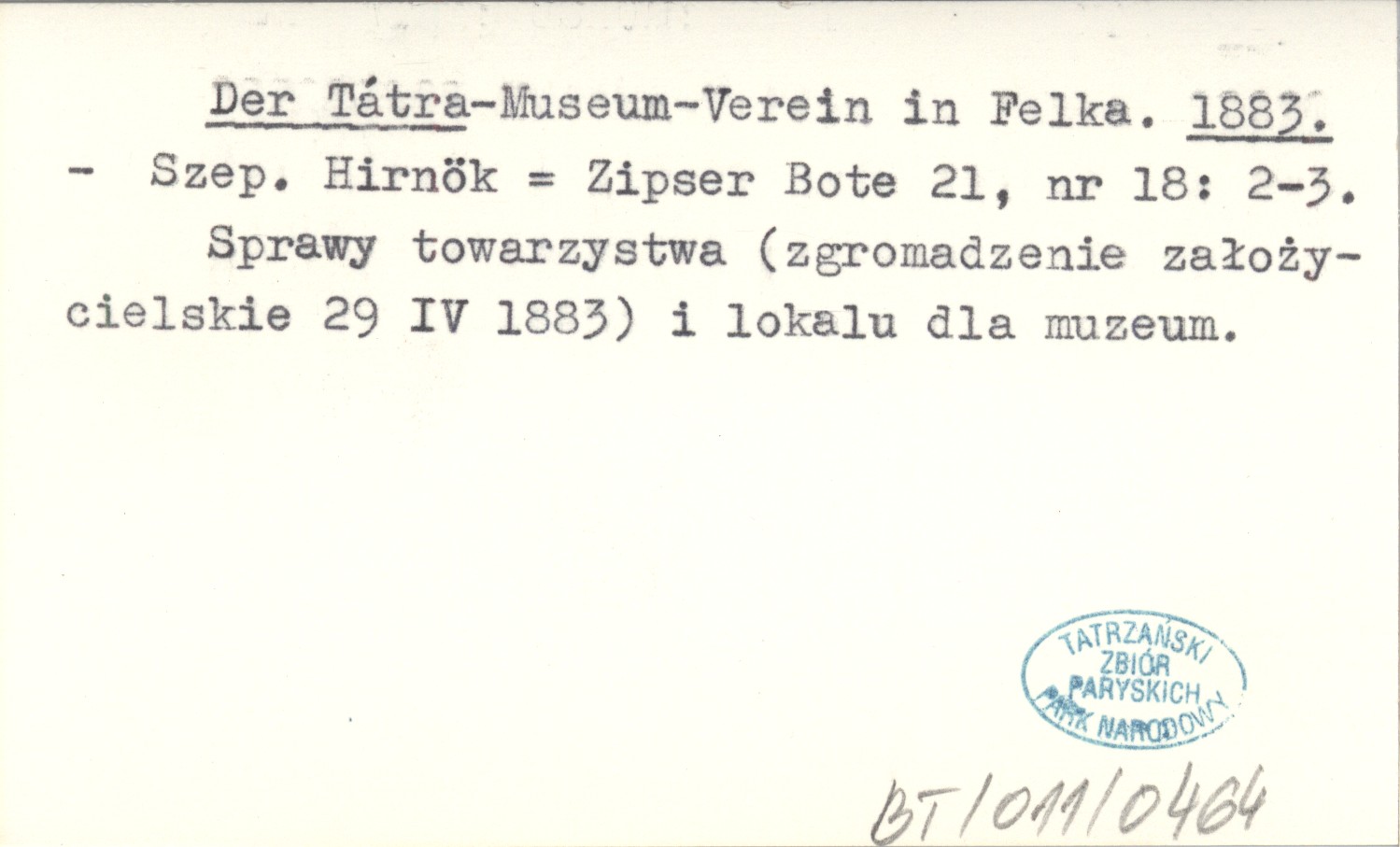 Szepesi Hirnök = Zipser Bote, 21, nr 18: 2-3. Sprawy towarzystwa (zgromadzenie założycielskie 29 IV 1883) i lokalu dla muzeum.