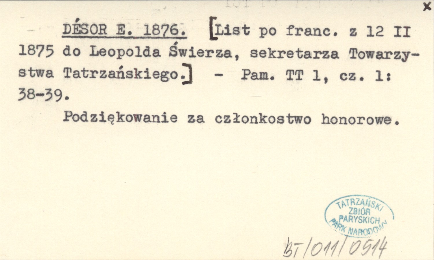 DÉSOR E. 1876 [List po francusku z 12 II 1875 do Leopolda Świerza, sekretarza Towarzystwa Tatrzańskiego].