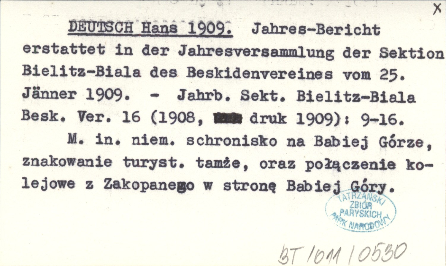 Jahresbericht der Sektion Bielitz-Biala des Beskiden-Vereines, 16 (1908, druk 1909): 9-16. M. in. niemieckie schronisko na Babiej Górze, znakowanie turystyczne tamże, oraz połączenie kolejowe z Zakopanem w stronę Babiej Góry.