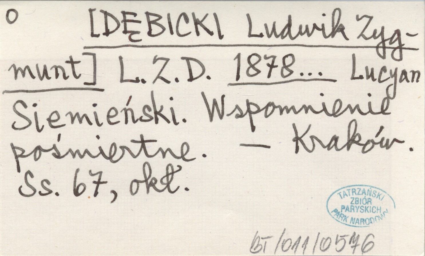 L. Z. D. [DĘBICKI Ludwik Zygmunt] 1878... Lucyan Siemieński. Wspomnienie pośmiertne.