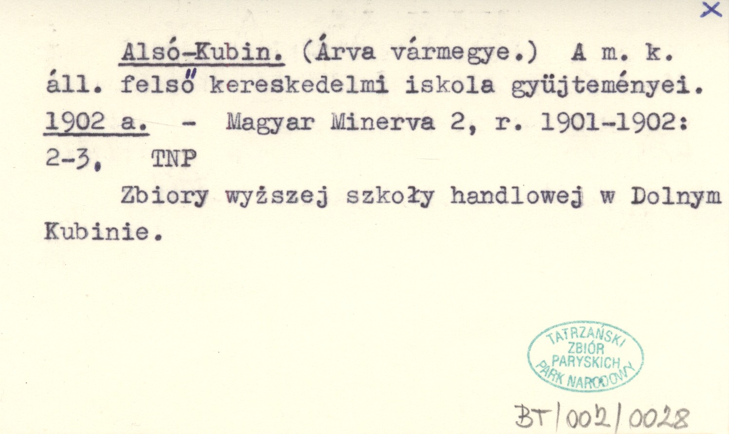 Alsó-Kubin. (Árva vármegye.) A m. k. áll. felsö kereskedelmi iskola gyüjteményei. 1902 a