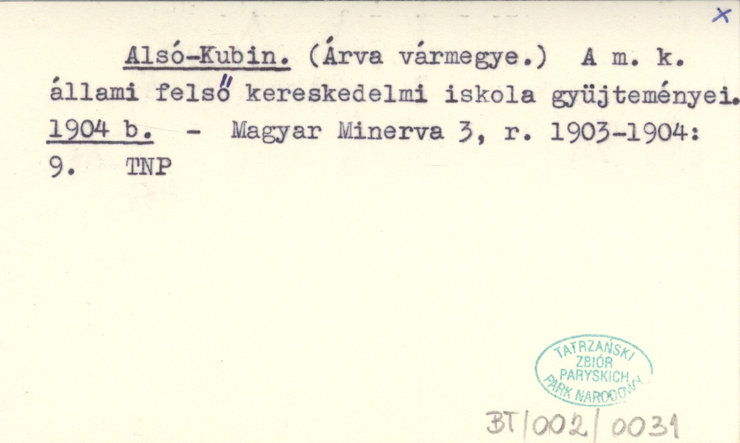 Alsó-Kubin. (Árva vármegye.) A m. k. állami felsö kereskedelmi iskola gyüjteményei. 1904 b