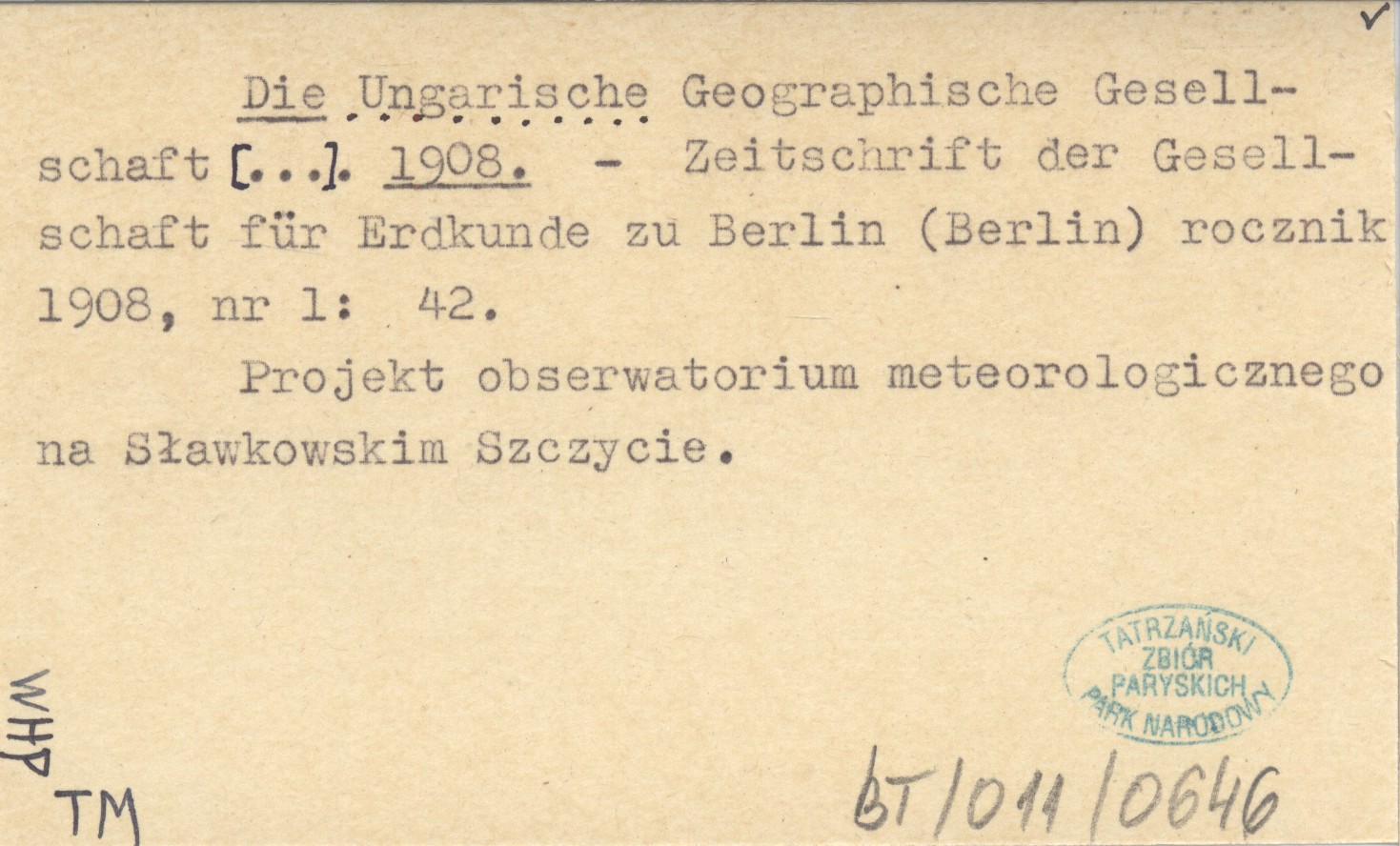 Zeitschrift der Gesellschaft für Erdkunde zu Berlin (Berlin) , R. 1908, nr 1: 42. Projekt obserwatorium meteorologicznego na Sławkowskim Szczycie.