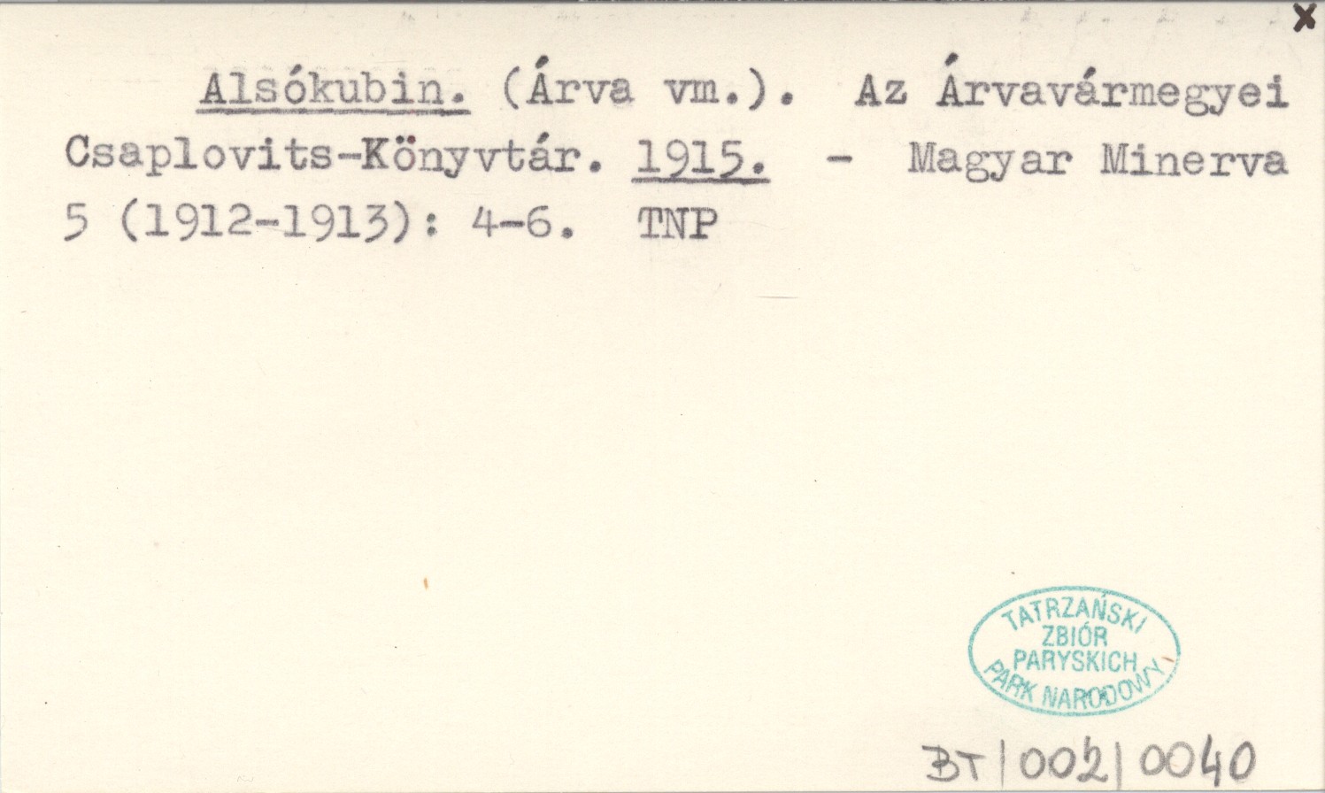 Alsókubin. (Árva vm.). Az Árvavármegyei Csaplovits-Könyvtár. 1915
