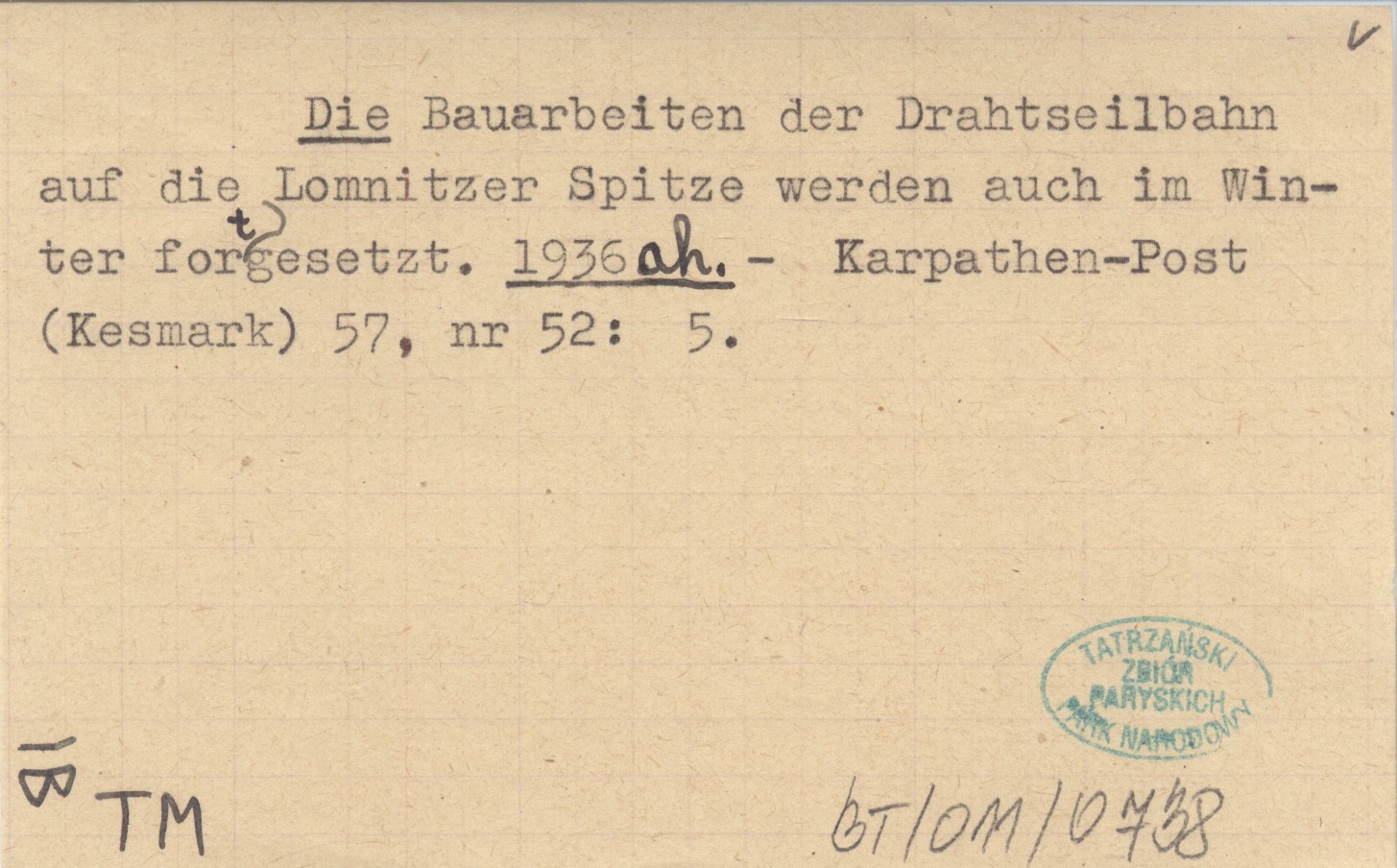 Die Bauarbeiten der Drahtseilbahn auf die Lomnitzer Spitze werden auch im Winter fortgesetz. 1936 ah