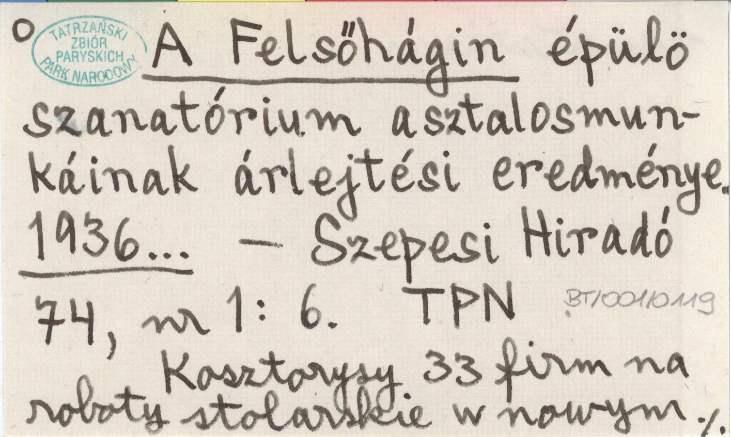 Szepesi Hiradó, 74, nr 1: 6. Kosztorysy 33 firm na roboty stolarskie w nowym sanatorium.