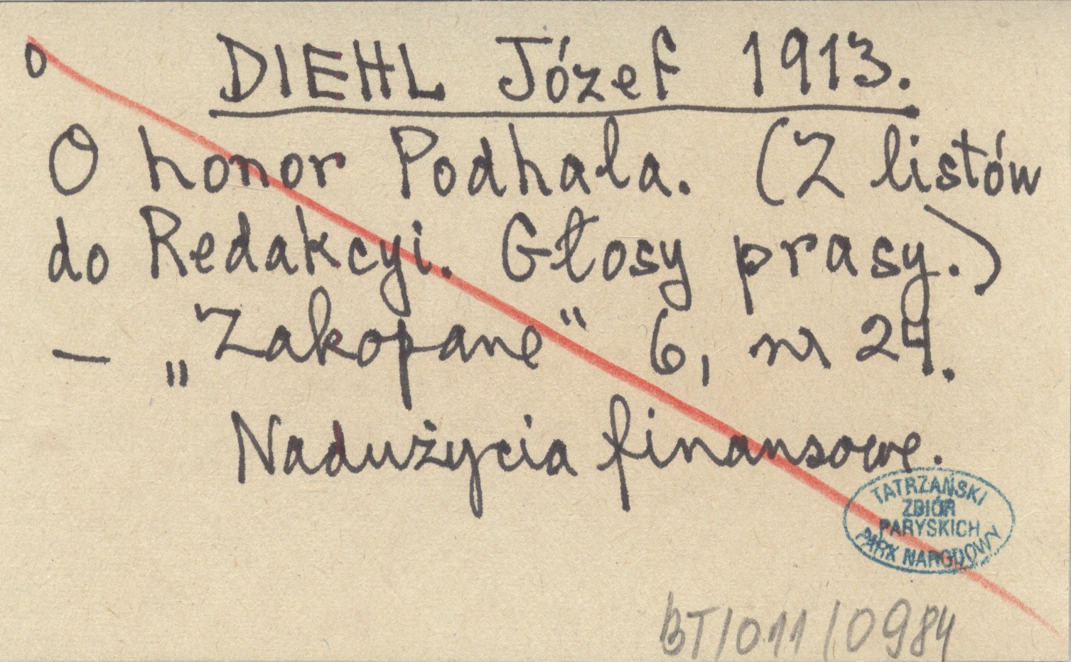 DIEHL Józef 1913 O honor Podhala. (Z listów do Redakcyi. Głosy prasy).