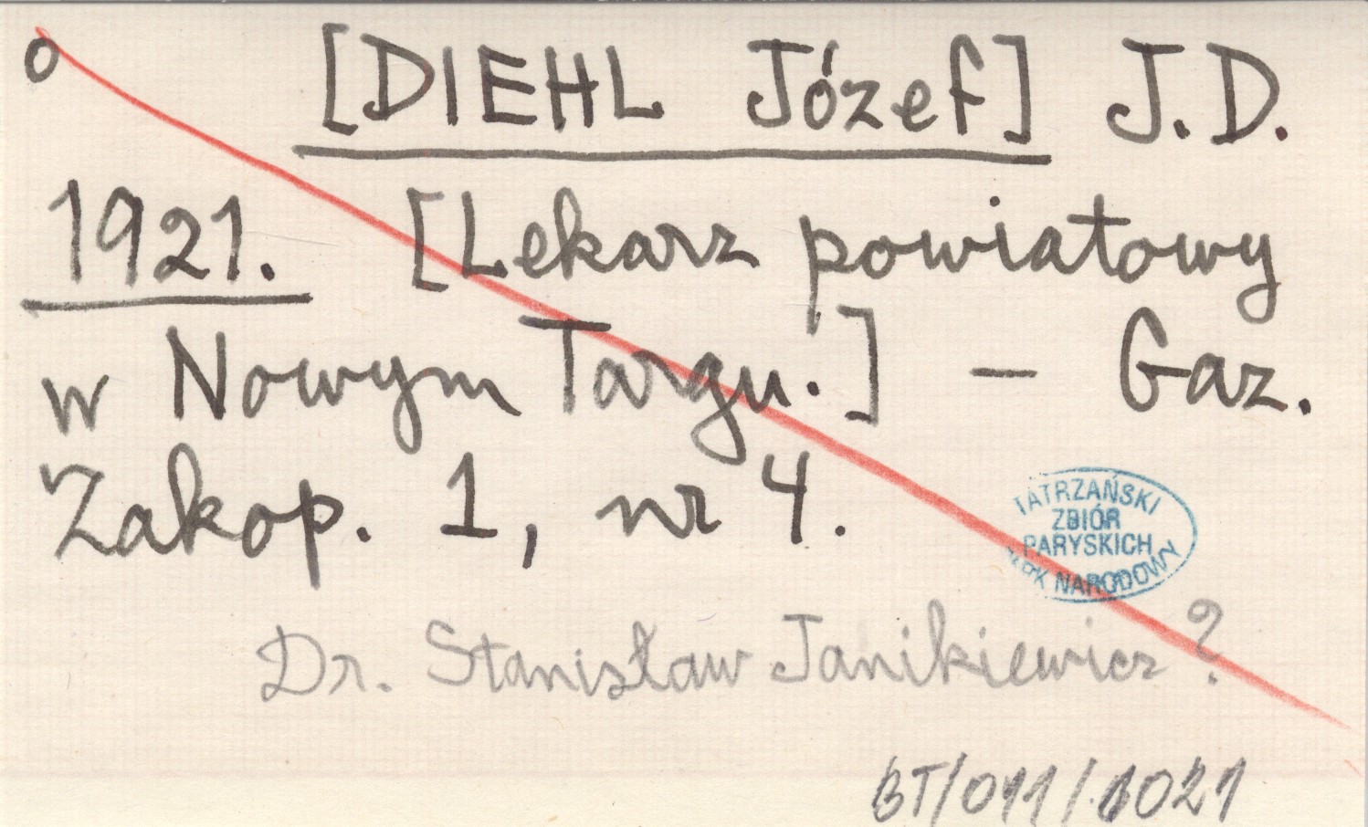J. D. [DIEHL Józef] 1921 [Lekarz powiatowy w Nowym Targu].