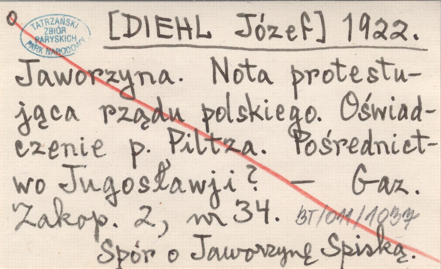 [DIEHL Józef] 1922 Jaworzyna. Nota protestująca rządu polskiego. Oświadczenie p. Piltza. Pośrednictwo Jugosławji?