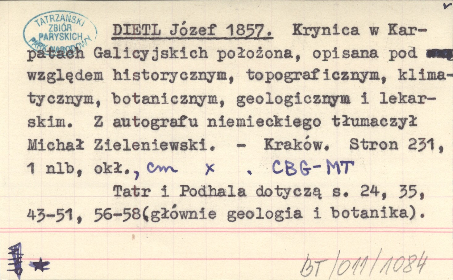 DIETL Józef 1857 Krynica w Karpatach Galicyjskich położona, opisana pod względem historycznym, topograficznym, klimatycznym, botanicznym, geologicznym i lekarskim. Z autografu niemieckiego tłumaczył Michał Zieleniewski.