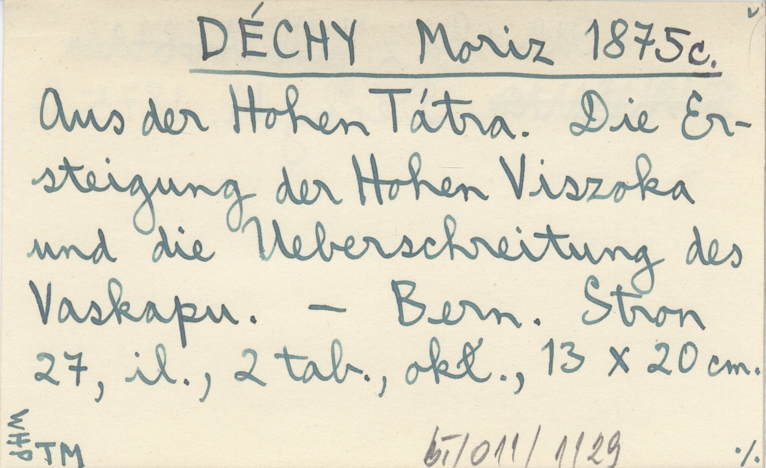DÉCHY Moritz 1875 c Aus der Hohen Tátra. Die Ersteigung der Hohen Viszoka und die Ueberschreitung des Vaskapu.