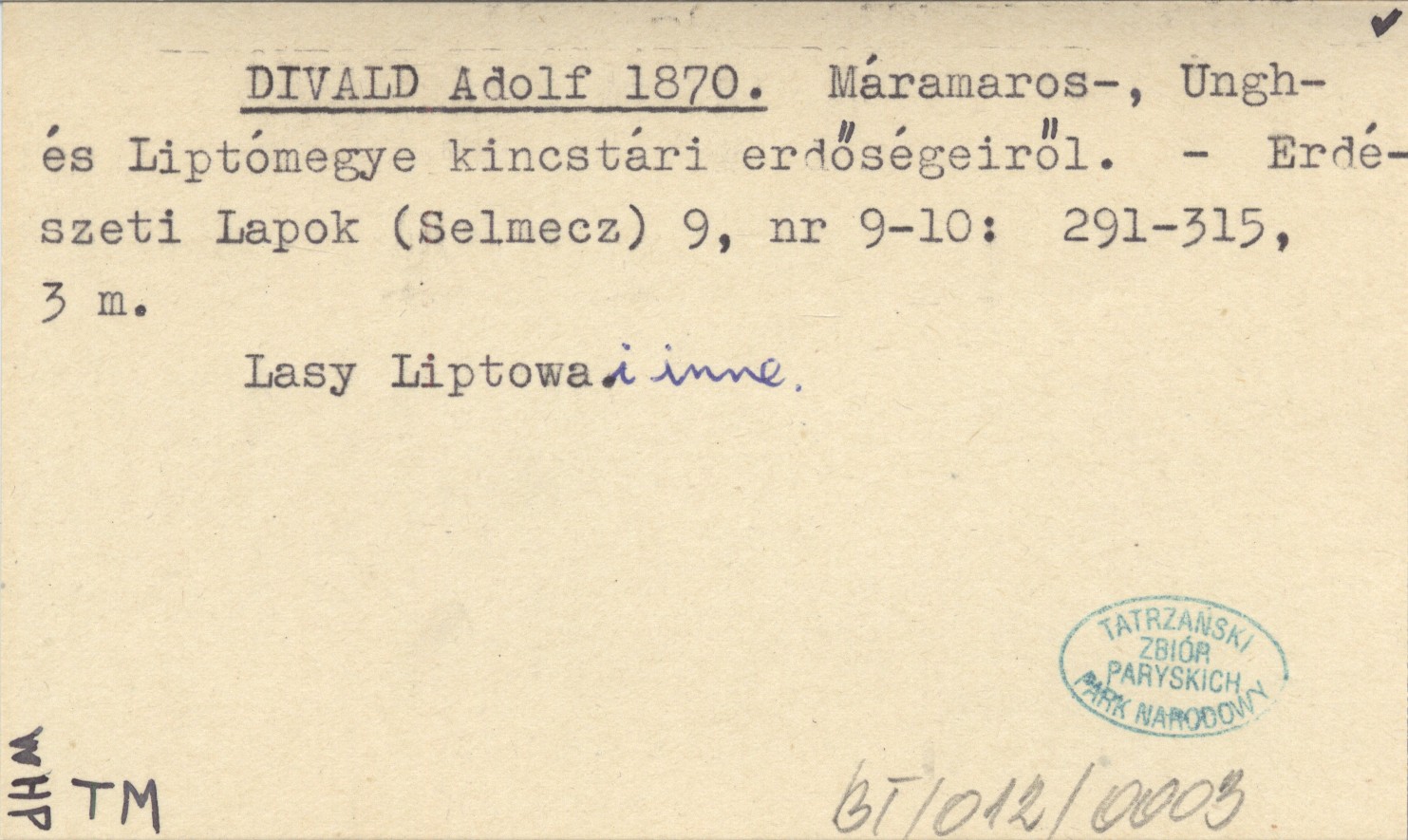 DIVALD Adolf 1870 Máramaros-, Unghés Liptómegye kincstári erdőségeiről.