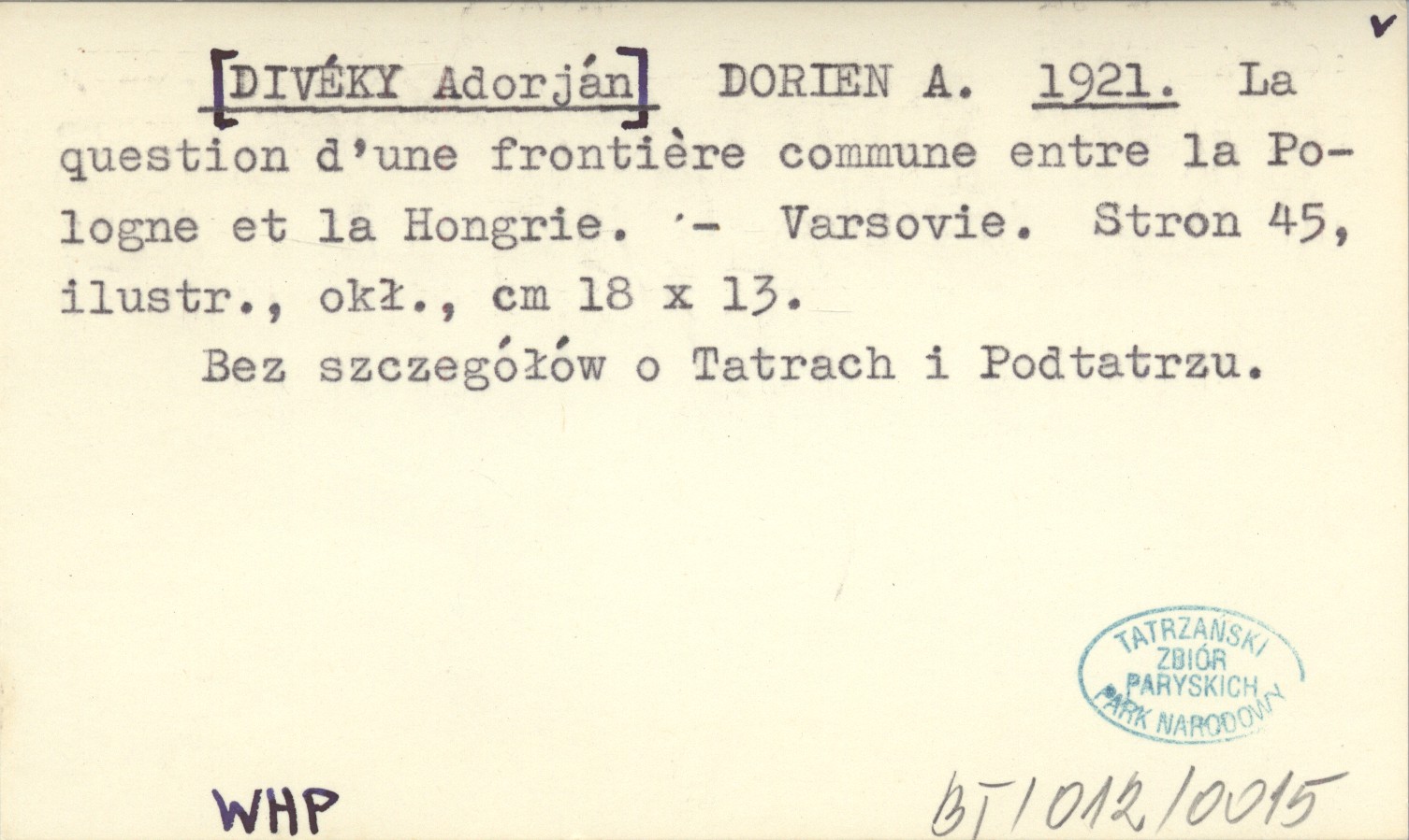 DORIEN A. [DIVÉKY Adorján 1921 La question d'une frontière commune entre la Pologne et la Hongrie.