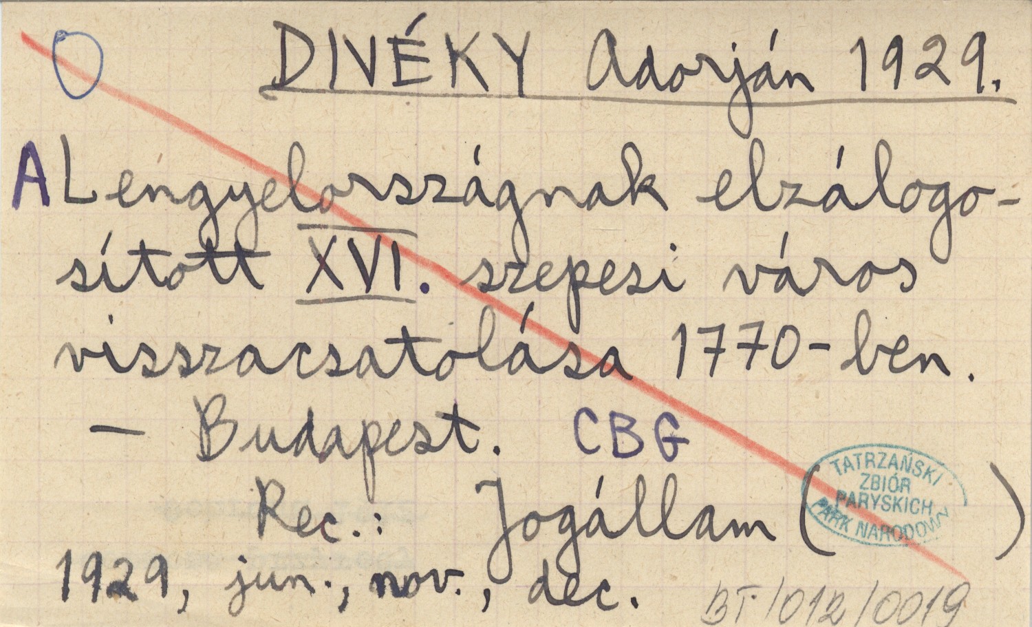 DIVÉKY Adorján 1929 A Lengyelországnak elzálogositott XVI. szepesi város visszacsatolása 1770-ben.