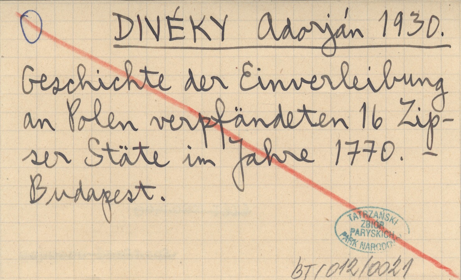 DIVÉKY Adorján 1930 Geschichte der Einverleibung an Polen verpfändeten 16 Zipser Stäte im Jahre 1770.