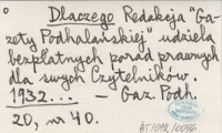 Dlaczego Redakcja "Gazety Podhalańskiej" udziela bezpłatnych porad prawnych dla swoich Czytelników. 1932...