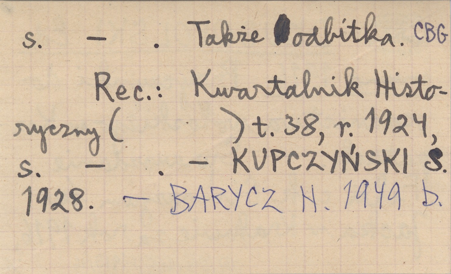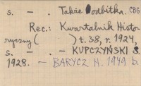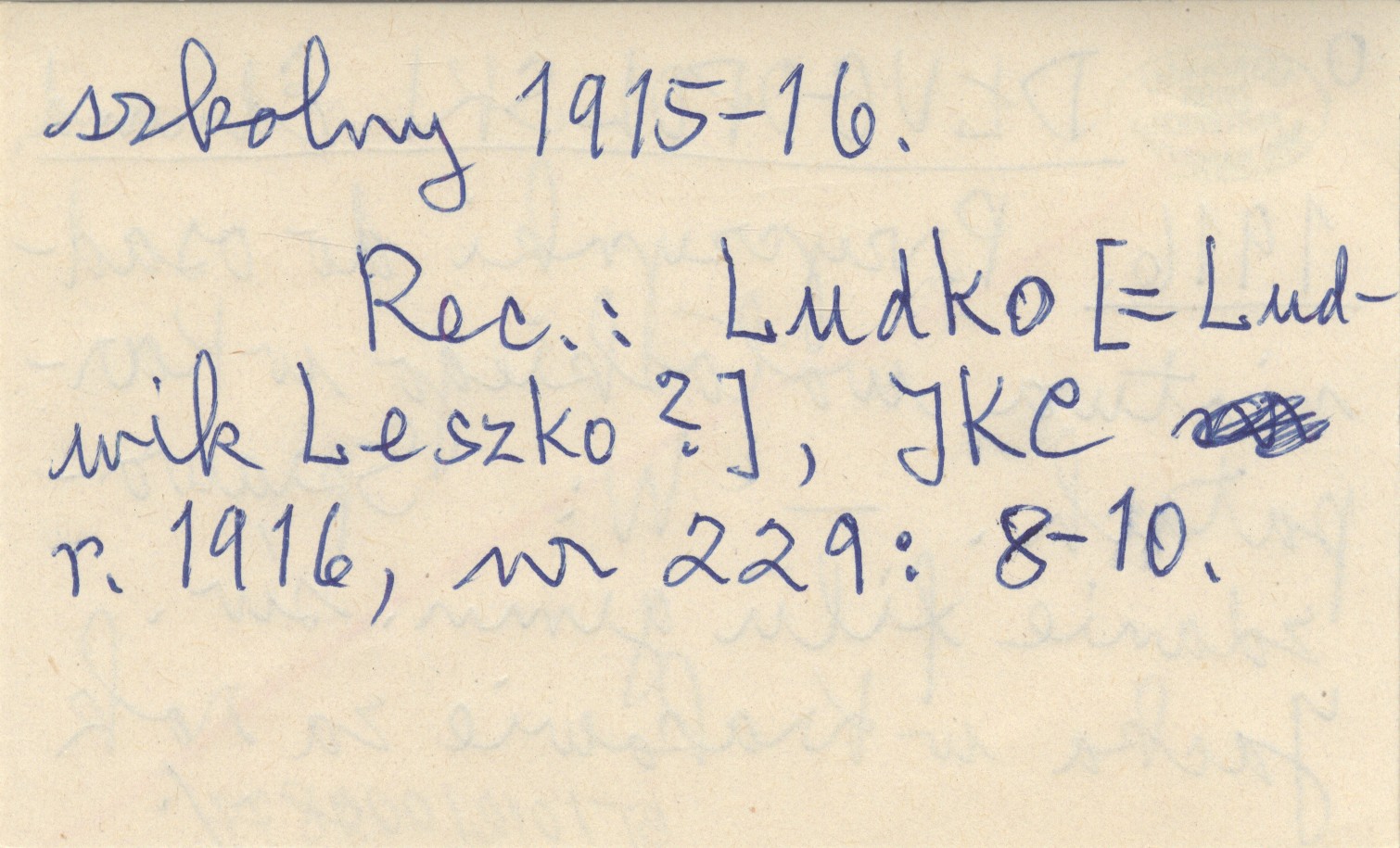 Sprawozdanie Filii c.k. Gimnazyum św. Jacka w Krakowie za rok szkolny 1915-16. , Także odb. REC: Kwartalnik Historyczny t. 38, r. 1924 ; KUPCZYŃSKI S. 1928 ; BARYCZ H. 1949 b ; [LESZKO Ludwik?] Ludko, Ilustrowany Kuryer Codzienny r. 1916, nr 229: 8-10. ;