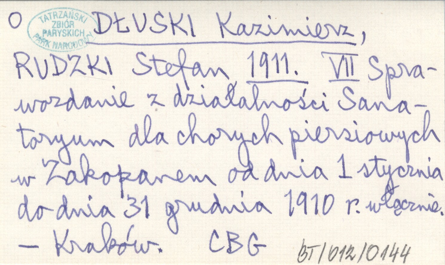 DŁUSKI Kazimierz RUDZKI, Stefan. ; 1911 VII Sprawozdanie z działalności Sanatoryum dla chorych piersiowych w Zakopanem od dnia 1 stycznia do dnia 31 grudnia 1910 r. włącznie.