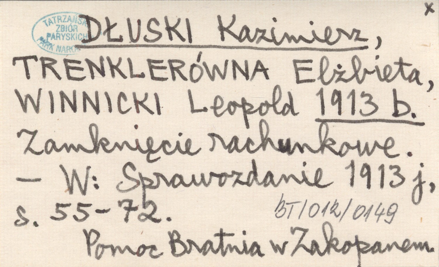 DŁUSKI Kazimierz TRENKLERÓWNA, Elżbieta. ; WINNICKI, Leopold. ; 1913 b Zamknięcie rachunkowe.