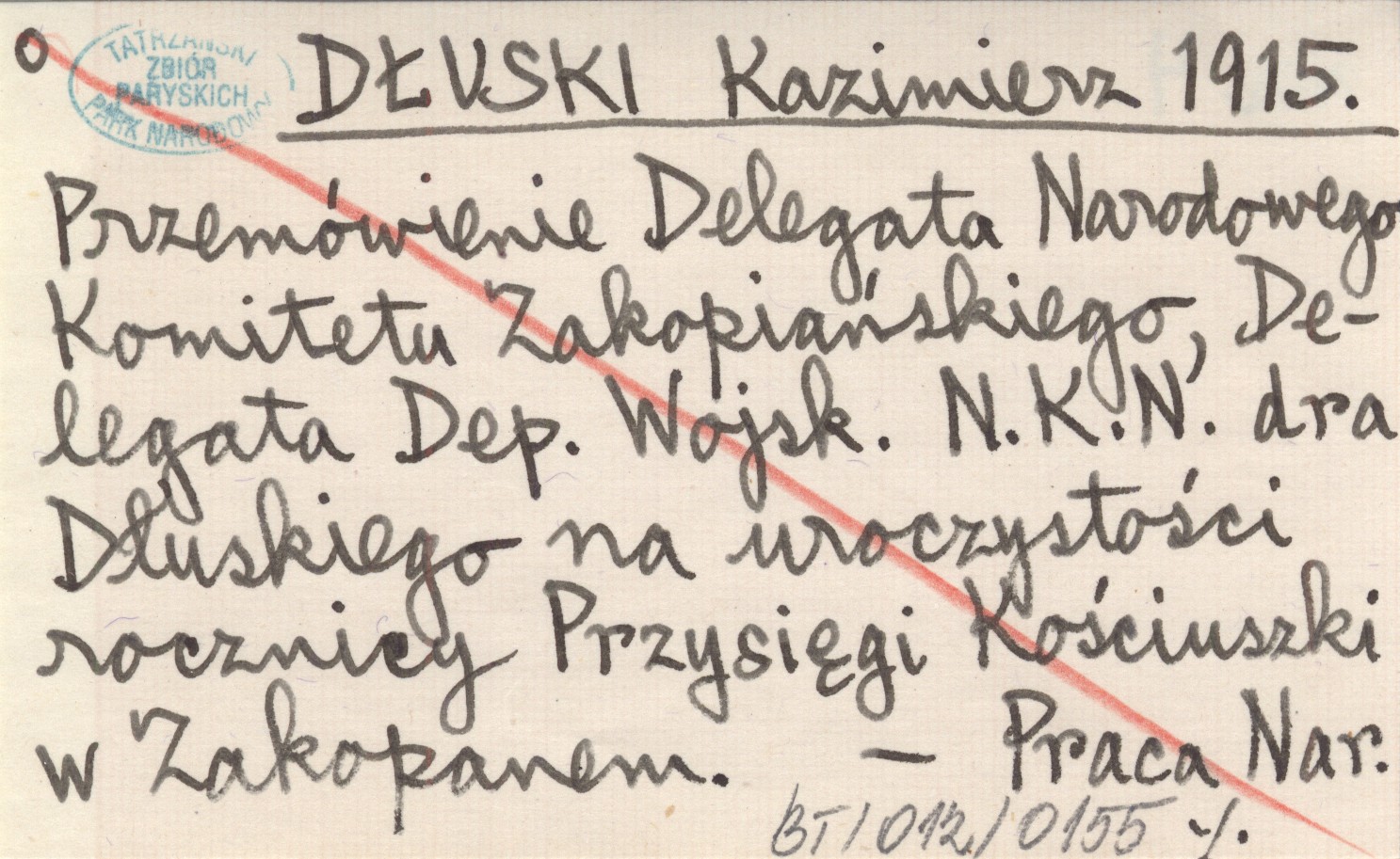 DŁUSKI Kazimierz 1915 Przemówienie Delegata Narodowego Komitetu Zakopiańskiego, Delegata Dep. Wojsk. N.K.N. dra Dłuskiego na uroczystości rocznicy Przysięgi Kościuszki w Zakopanem.