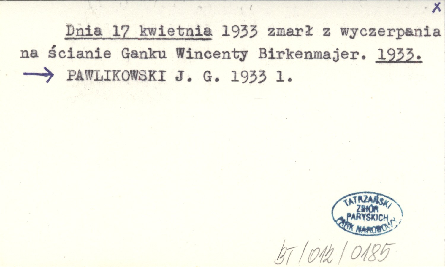 Dnia 17 kwietnia 1933 zmarł z wyczerpania na ścianie Ganku Wincenty Birkenmajer. 1933