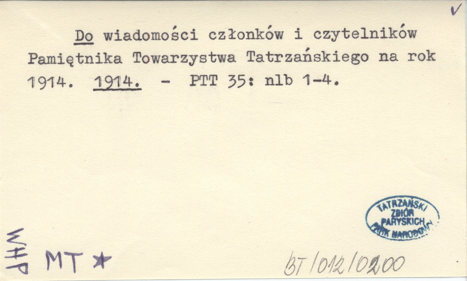 Do wiadomości członków i czytelników Pamiętnika Towarzystwa Tatrzańskiego na rok 1914. 1914