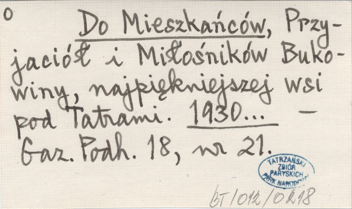 Do Mieszkańców, Przyjaciół i Miłośników Bukowiny, najpiękniejszej wsi pod Tatrami. 1930...