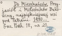Do Mieszkańców, Przyjaciół i Miłośników Bukowiny, najpiękniejszej wsi pod Tatrami. 1930...