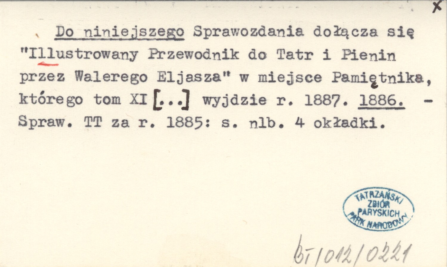 Do niniejszego Sprawozdania dołącza się "Illustrowany Przewodnik do Tatr i Pienin przez Walerego Eljasza" w miejsce Pamiętnika, którego tom XI [...] wyjdzie r. 1887. 1886