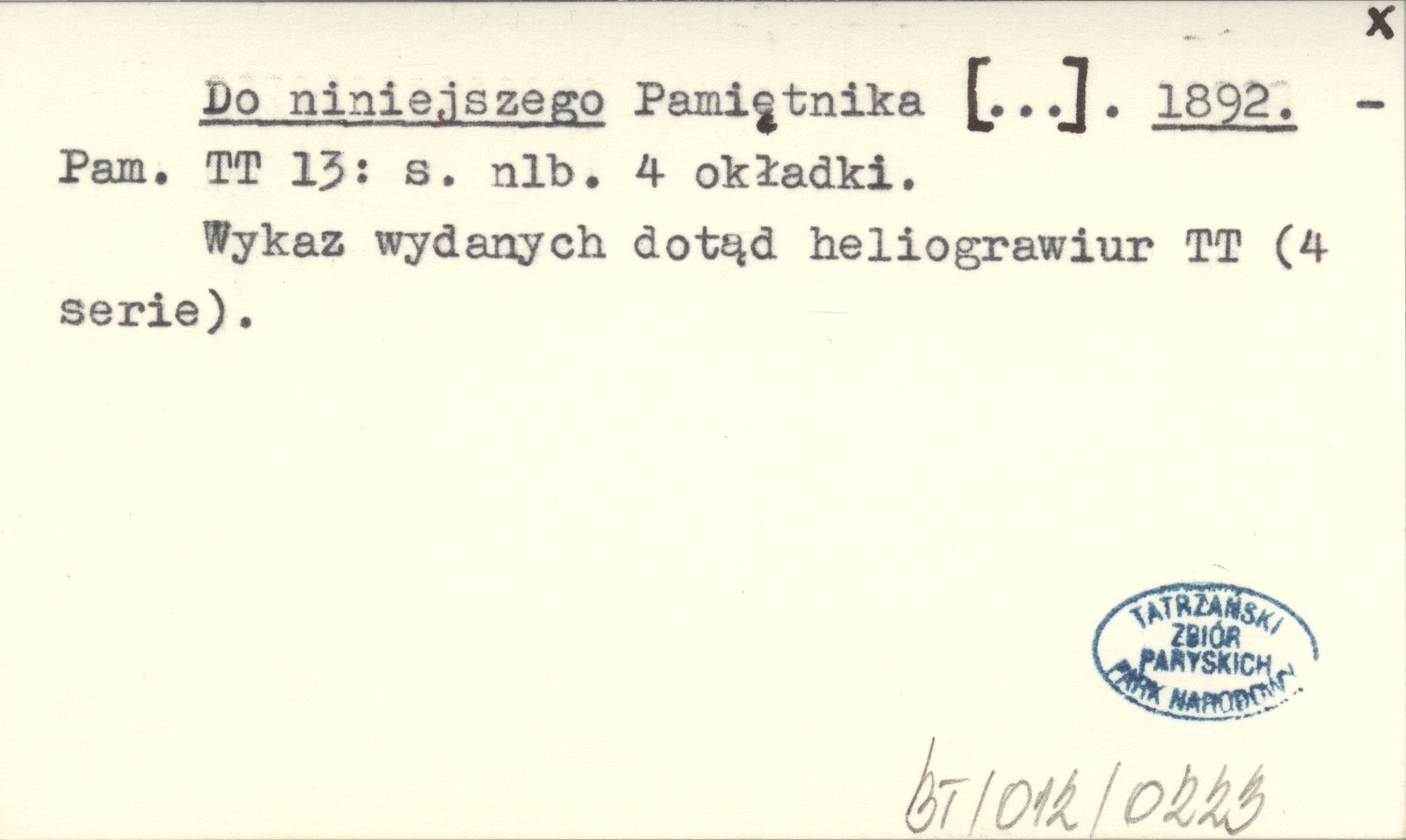 Pamiętnik Towarzystwa Tatrzańskiego, 13: [4] s. okł. Wykaz wydanych dotąd heliograwiur TT (4 serie).