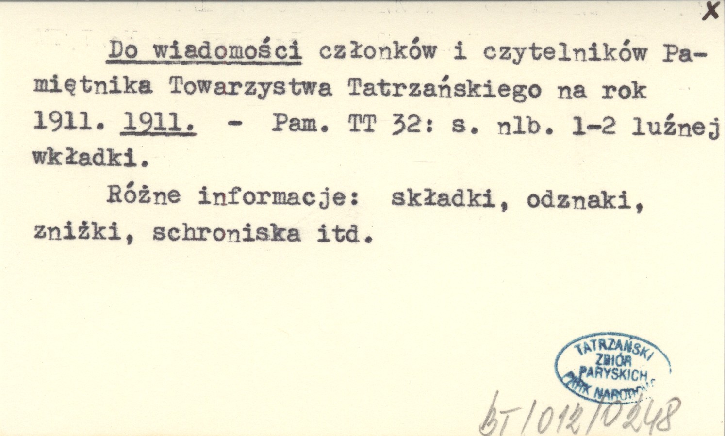 Do wiadomości członków i czytelników Pamiętnika Towarzystwa Tatrzańskiego na rok 1911. 1911