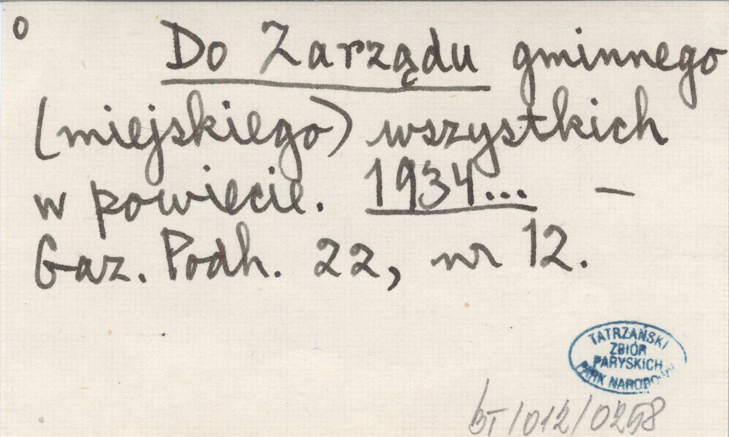 Do Zarządu gminnego (miejskiego) wszystkich w powiecie. 1934...