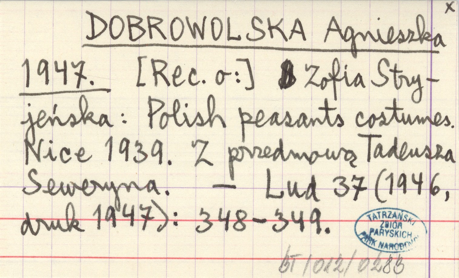 DOBROWOLSKA Agnieszka 1947 [Rec. o:] Zofia Stryjeńska: Polish pearants costumers. Nice 1939. Z przedmową Tadeusza Seweryna.