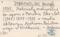 DOBROWOLSKI Henryk 1975 Materiały archiwalne do sporu o Morskie Oko z lat (1787) 1877-1908 w zasobie aktowym Archiwum Państwowego w Krakowie.