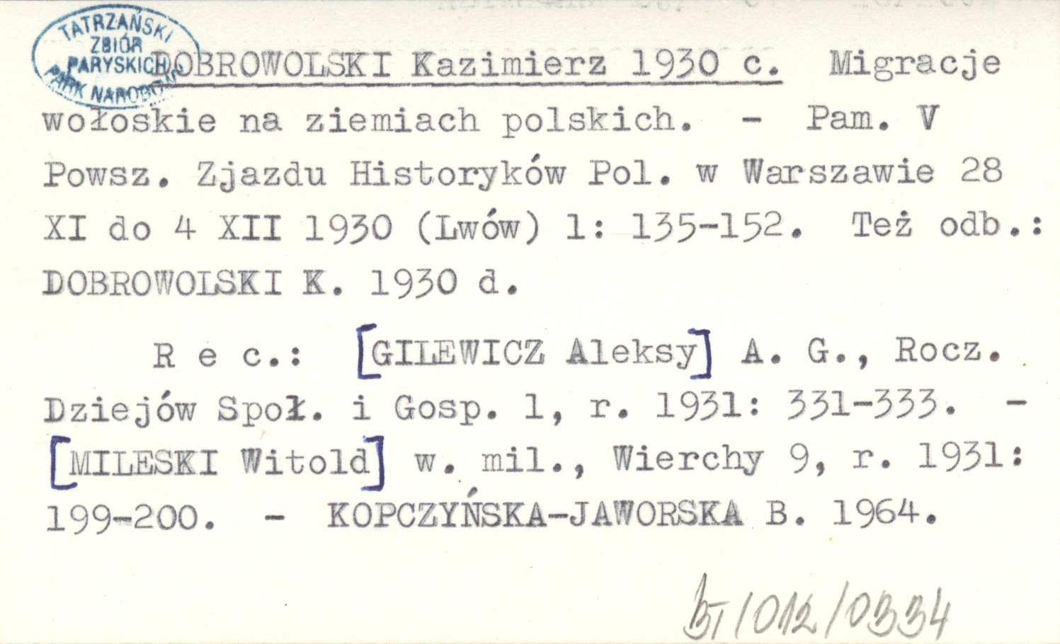 Pamiętnik V Powszechnego Zjazdu Historyków Polskich w Warszawie 28 XI do 4 XII 1930. Lwów , 1: 135-152. Też odb.: DOBROWOLSKI K. 1930 d REC: [GILEWICZ Aleksy] A. G., Roczniki Dziejów Społecznych i Gospodarczych 1, r. 1931: 331-333. ; [MILESKI Witold] w. mil., Wierchy 9, r. 1931: 199-200 ; KOPCZYŃSKA-JAWORSKA B. 1964 ;
