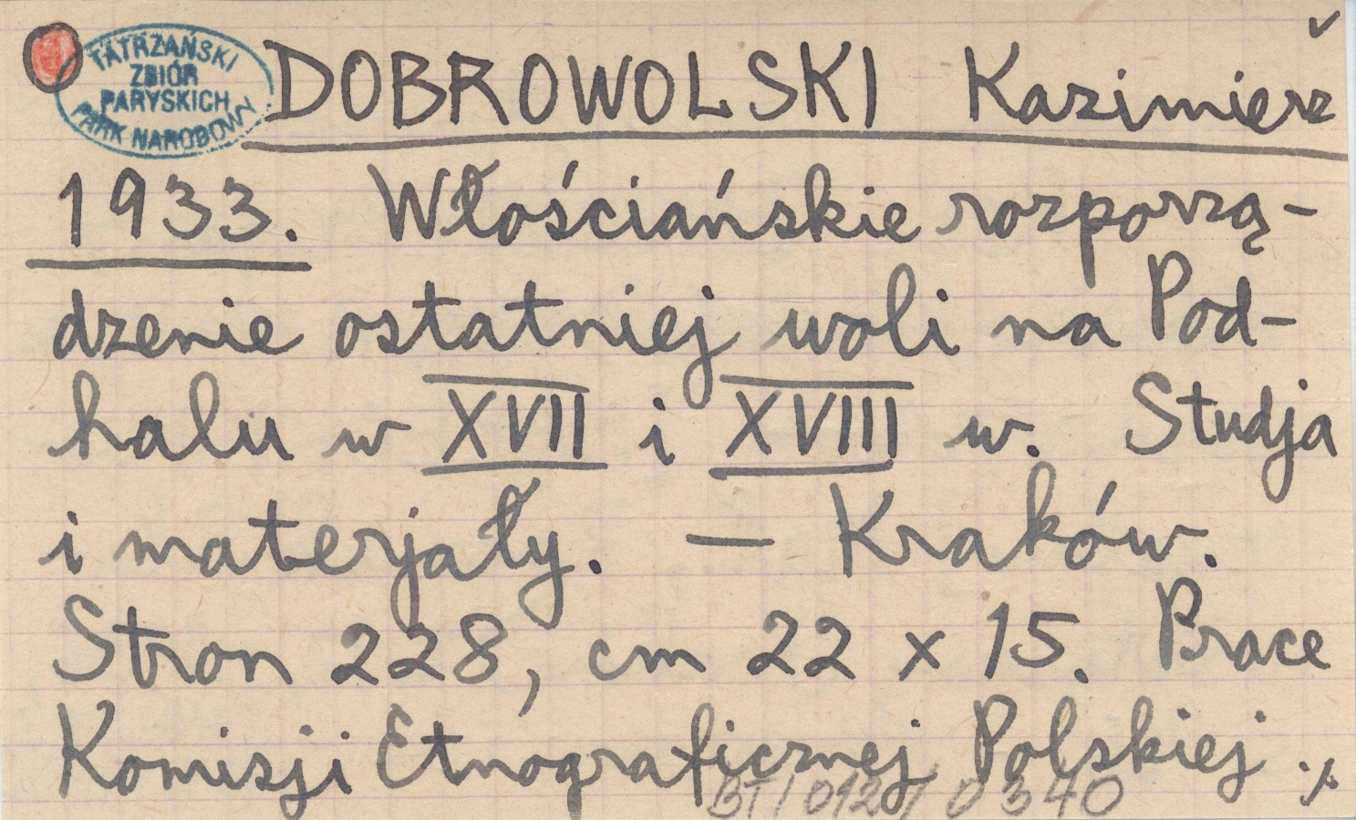 Kraków (Prace Komisji Etnograficznej Polskiej Akademji Umiejętności ; nr 15) , 228 s., 22x15 cm. REC: [MAŁECKI Mieczysław] Mał., Rocznik Slawistyczny (Kraków) t. 12, r. 1936: 166. ; INGLOT S. 1934, 1934 a ;
