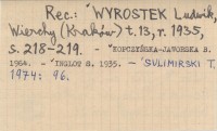 Lwów (Badania z Dziejów Społecznych i Gospodarczych ; nr 20) , [4], 113 s., 23x17 cm. REC: WYROSTEK Ludwik, Wierchy (Kraków) t. 13, r. 1935: 218-219. ; KOPCZYŃSKA-JAWORSKA B. 1964 ; INGLOT S. 1935 ; SULIMIRSKI T. 1974: 96. ;