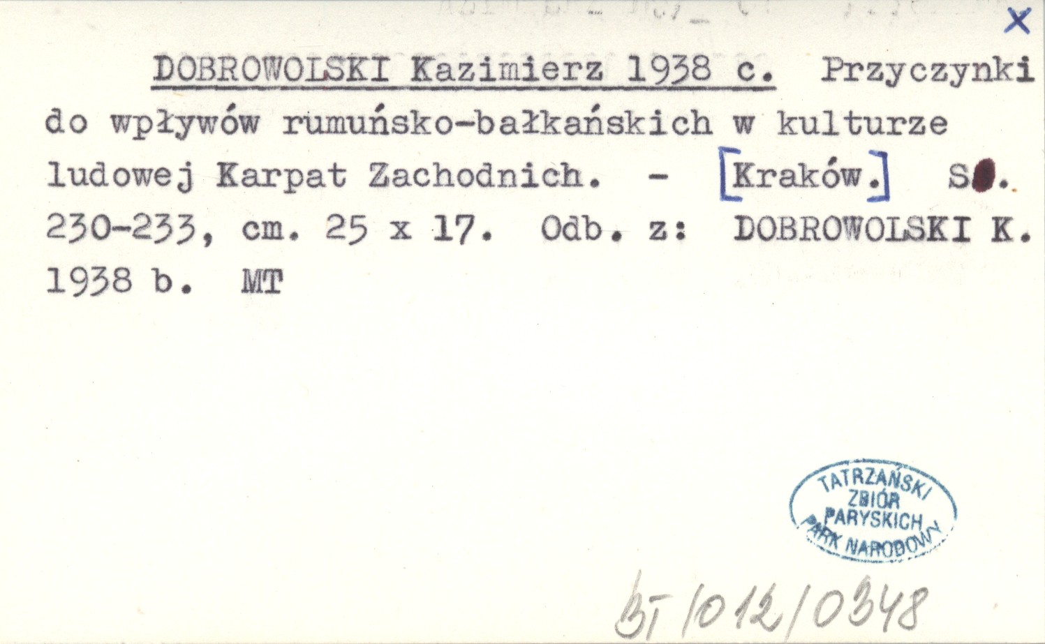 DOBROWOLSKI Kazimierz 1938 c Przyczynki do wpływów rumuńsko-bałkańskich w kulturze ludowej Karpat Zachodnich.