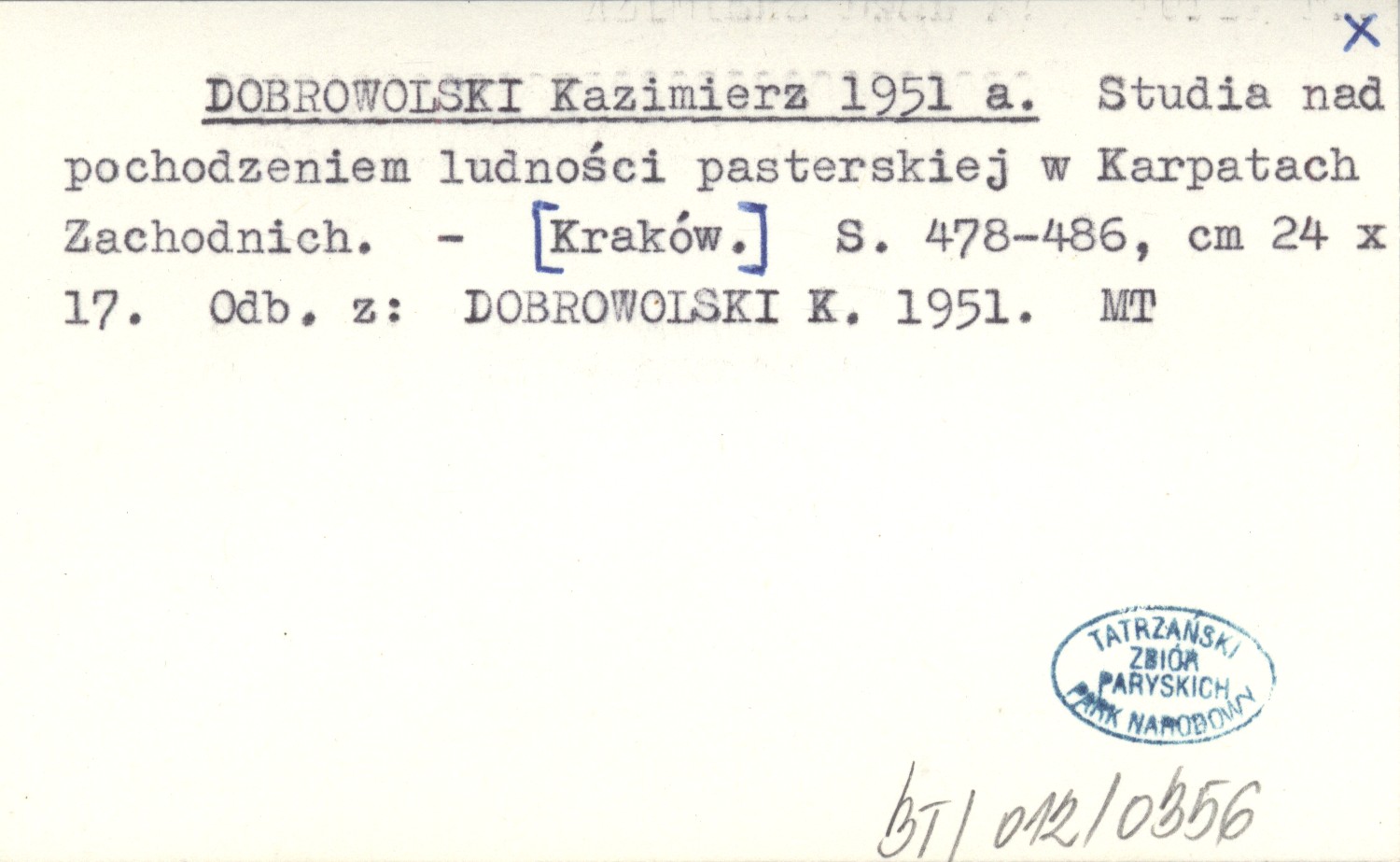 DOBROWOLSKI Kazimierz 1951 a Studia nad pochodzeniem ludności pasterskiej w Karpatach Zachodnich.