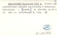 DOBROWOLSKI Kazimierz 1951 Studia nad pochodzeniem ludności pasterskiej w Karpatach Zachodnich.