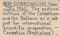 DOBROWOLSKI Kazimierz 1960 The pastoral culture of the Carpathians and the Balkans as a subject for international scientific co-operation.