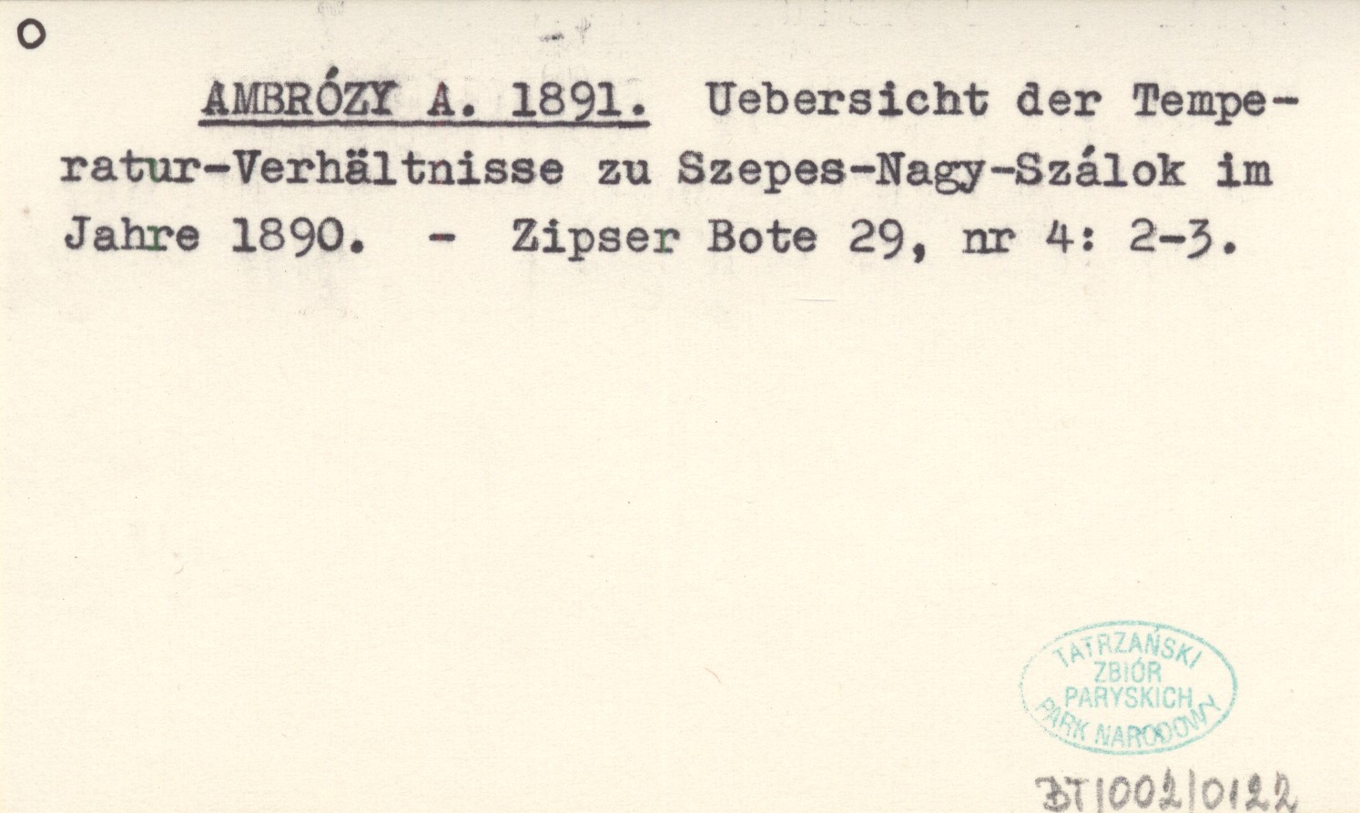 AMBRÓZY A. 1891 Uebersicht der Temperatur-Verhältnisse zu Szepes-Nagy-Szálok im Jahre 1890.