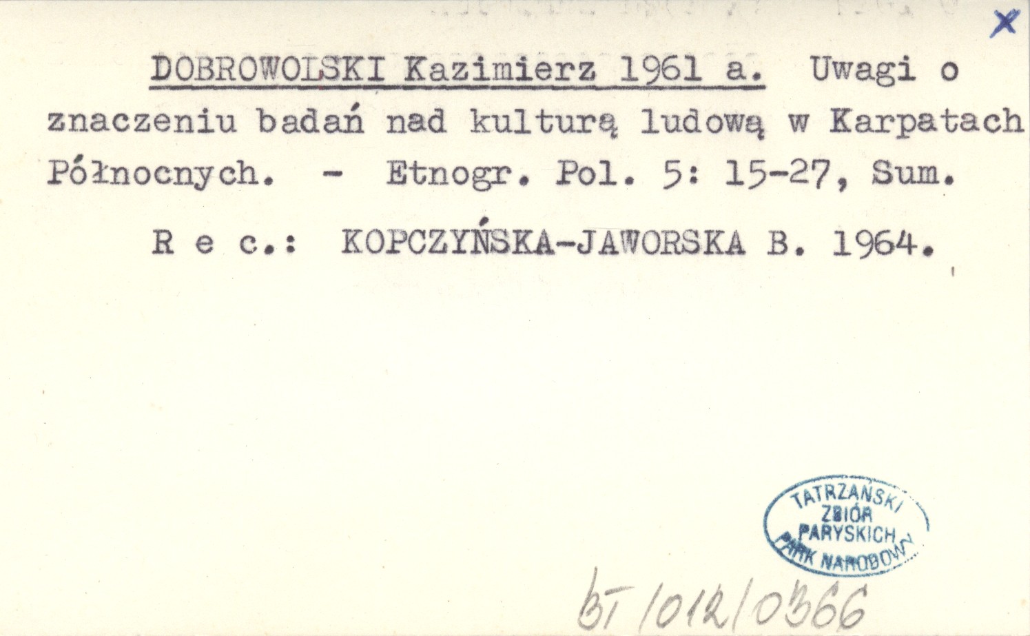 DOBROWOLSKI Kazimierz 1961 a Uwagi o znaczeniu badań nad kulturą ludową w Karpatach Północnych.