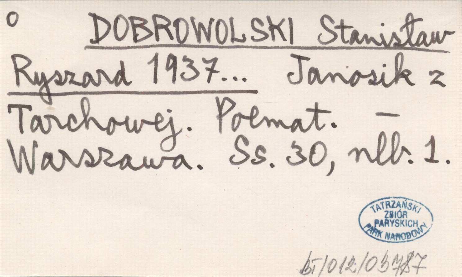 DOBROWOLSKI Stanisław Ryszard 1937 Janosik z Tarchowej. Poemat.