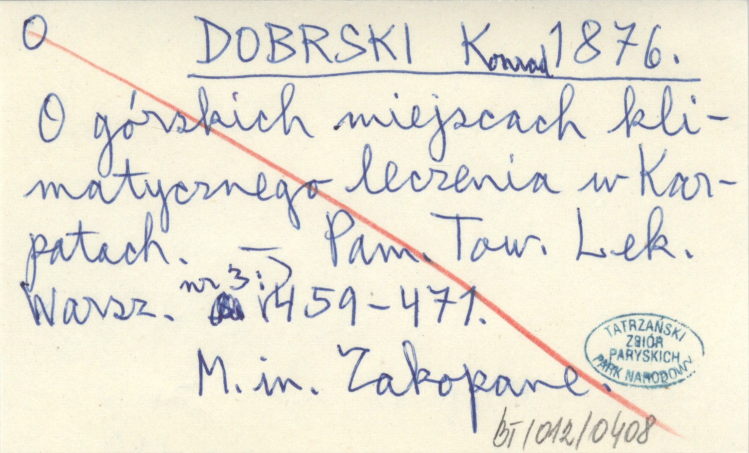 Pamiętnik Towarzystwa Lekarskiego Warszawskiego, Nr 3: 459-471. M. in. Zakopane.