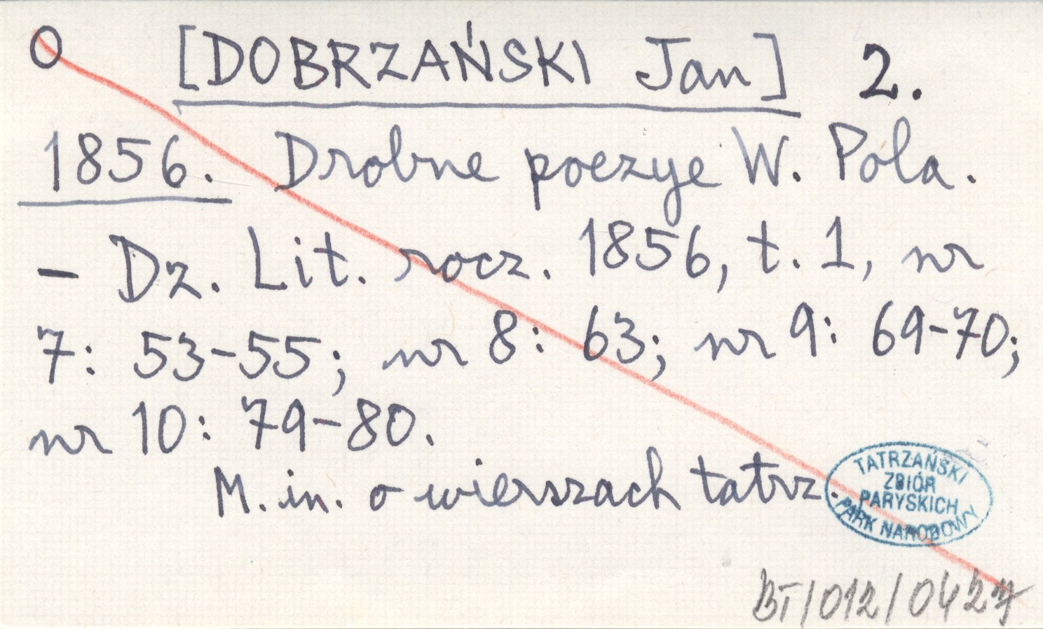 Dziennik Literacki, R. 1856, t. 1, nr 7: 53-55 ; nr 8: 63 ; nr 9: 69-70 ; nr 10: 79-80. M. in. o wierszach tatrzańskich.