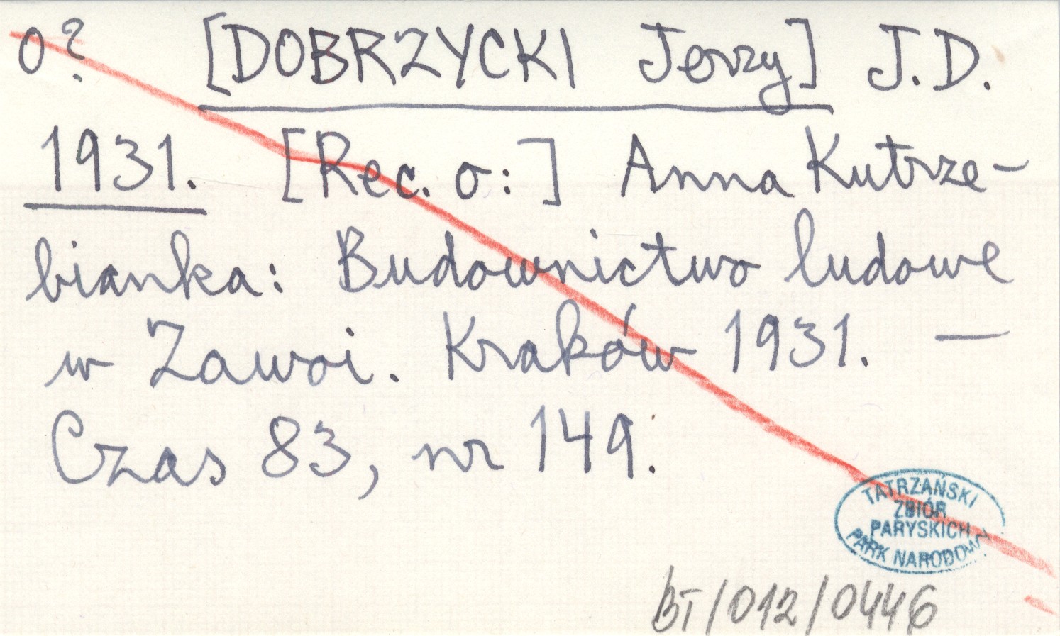 J. D. [DOBRZYCKI Jerzy] 1931 [Rec. o:] Anna Kutrzebianka: Budownictwo ludowe w Zawoi. Kraków 1931.